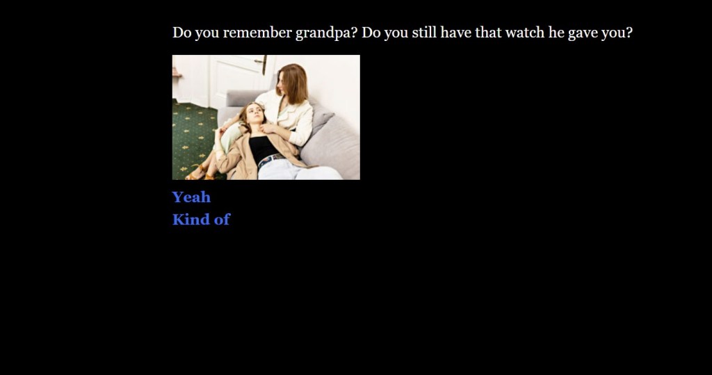 In this project, our professor allowed us to take creative liberties with a story that centered on the reader’s decision to determine the route of the narrative. The project was a fun, interactive story that can be played from a link provided through email, GitHub account, or another source. Here is a link to it https://njit.instructure.com/courses/54119/assignments/592041/submissions/68959?download=8844655